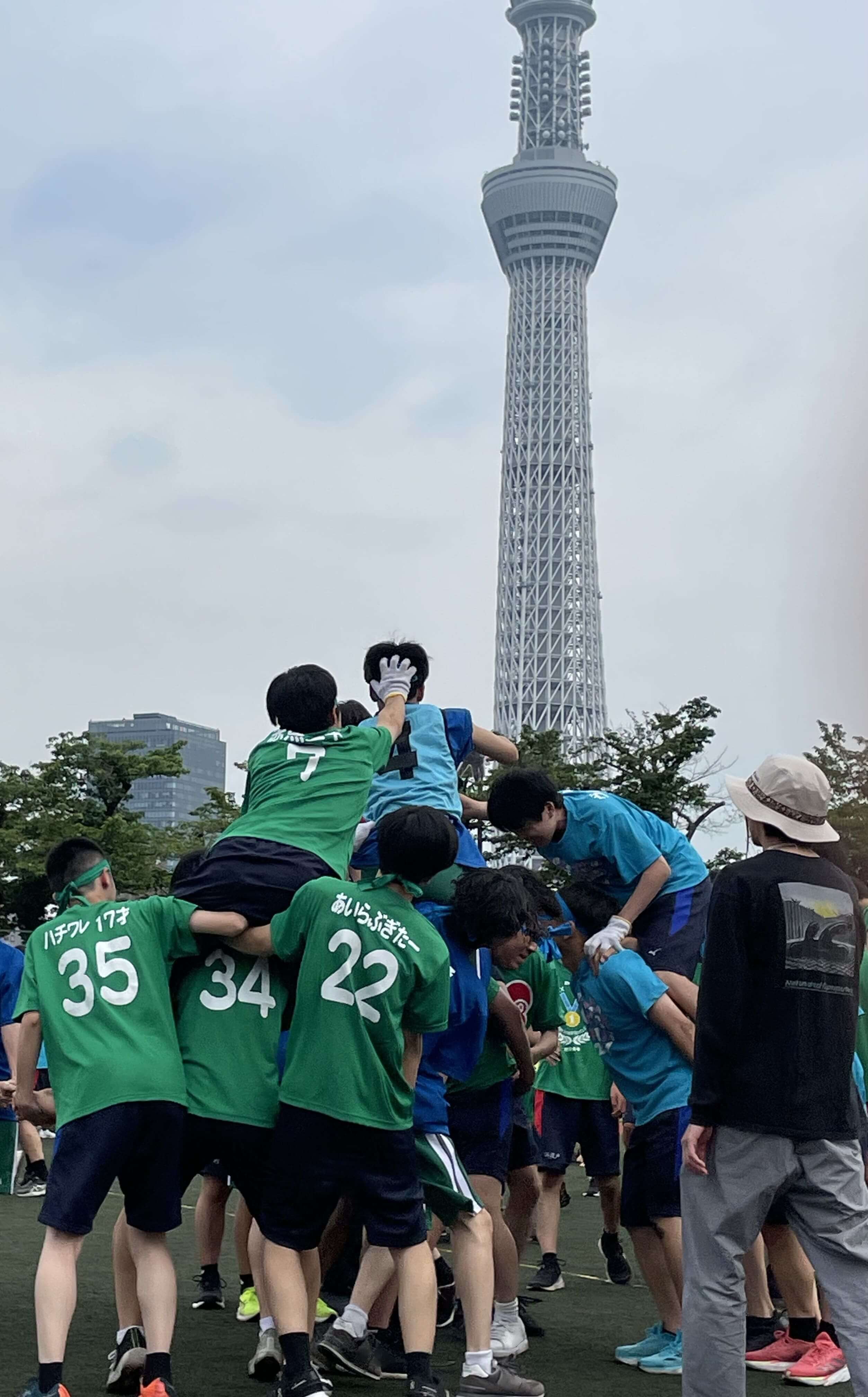 運動会で騎馬戦をしているときに撮った写真です。スカイツリーをバックに、優勝をかけて激闘している様子が映えるように切り取りました。