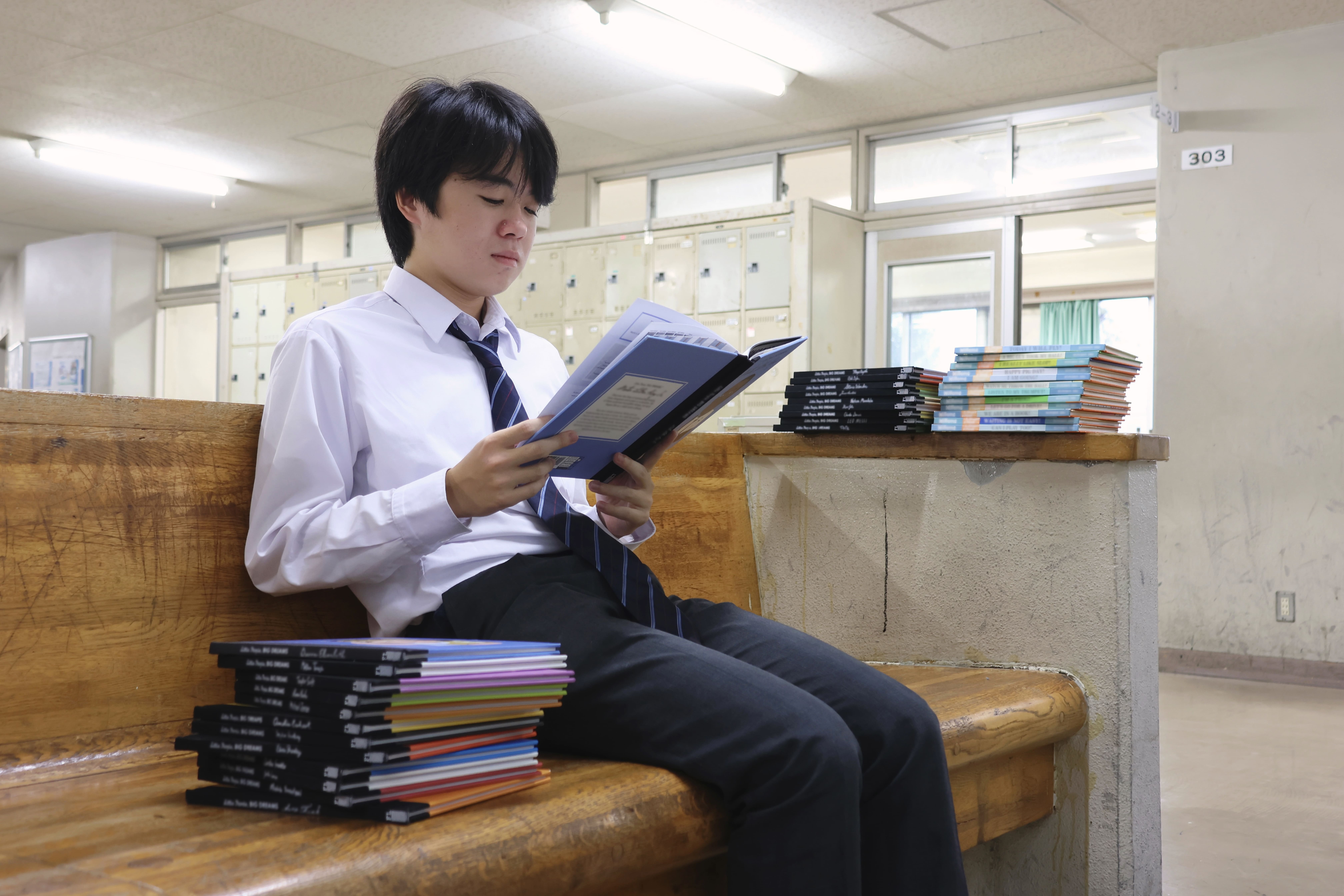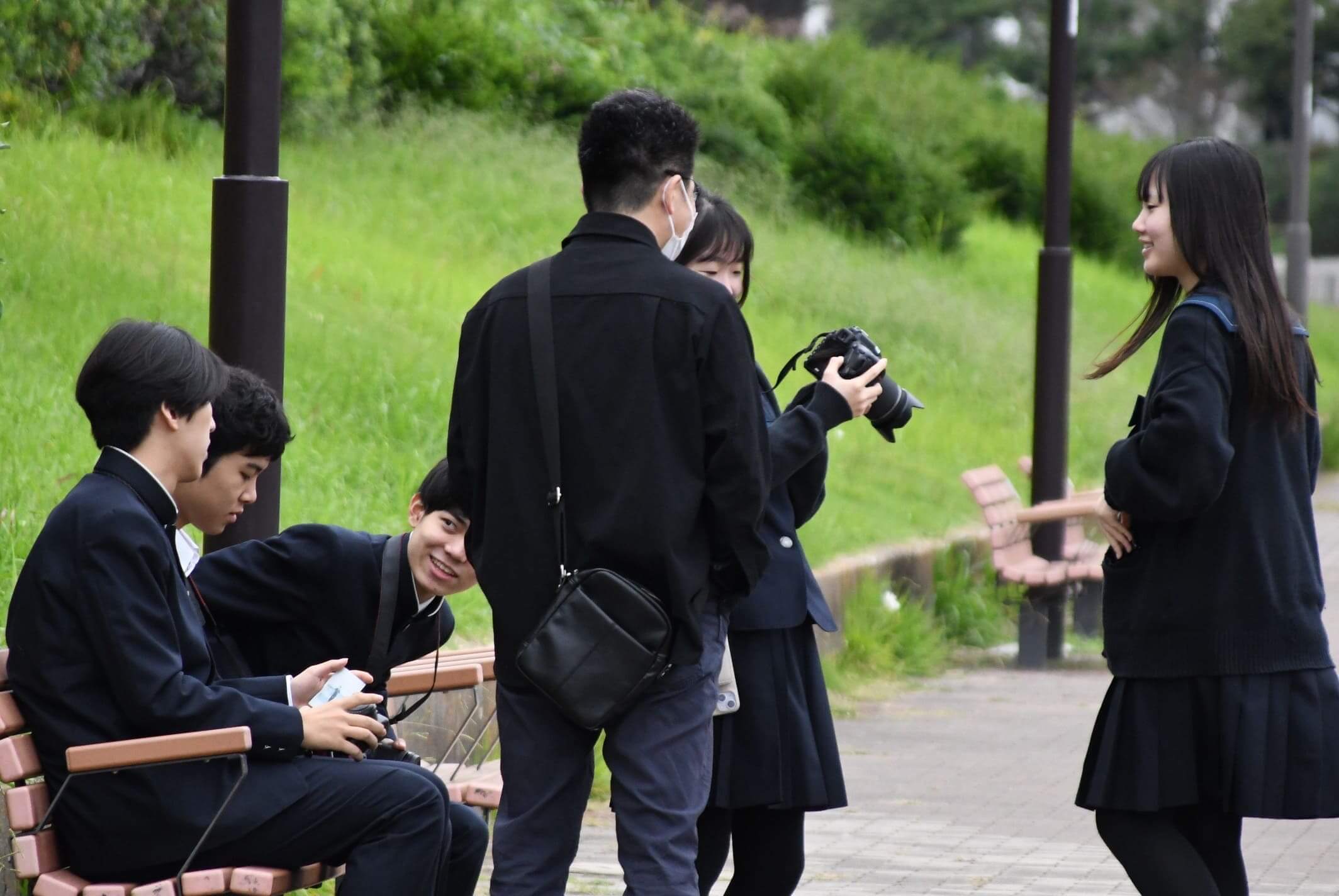 授業中に生徒が先生に撮った写真を見せていたりベンチで談笑していたりと違うことをしているけどなぜか一体感がある作品