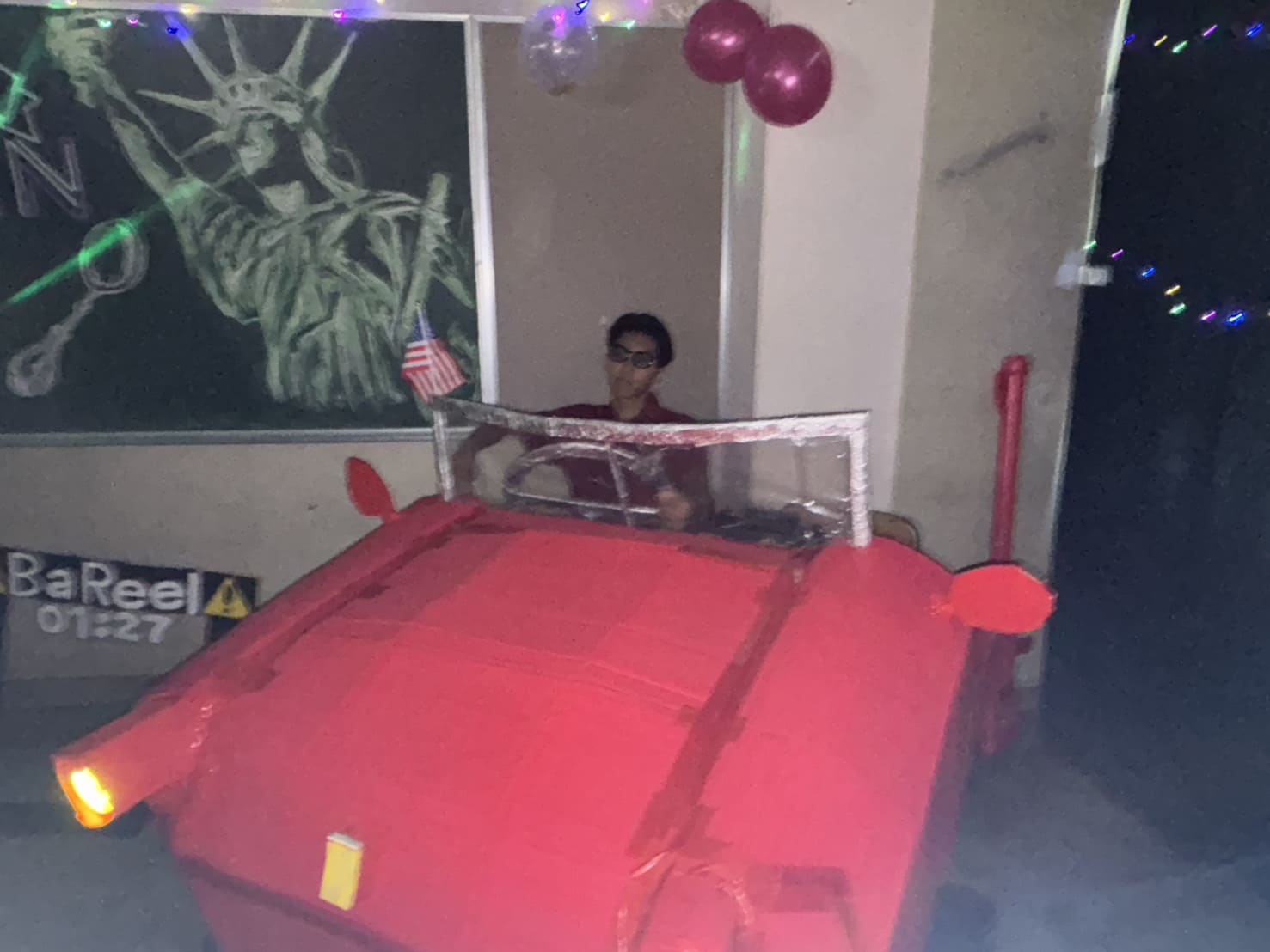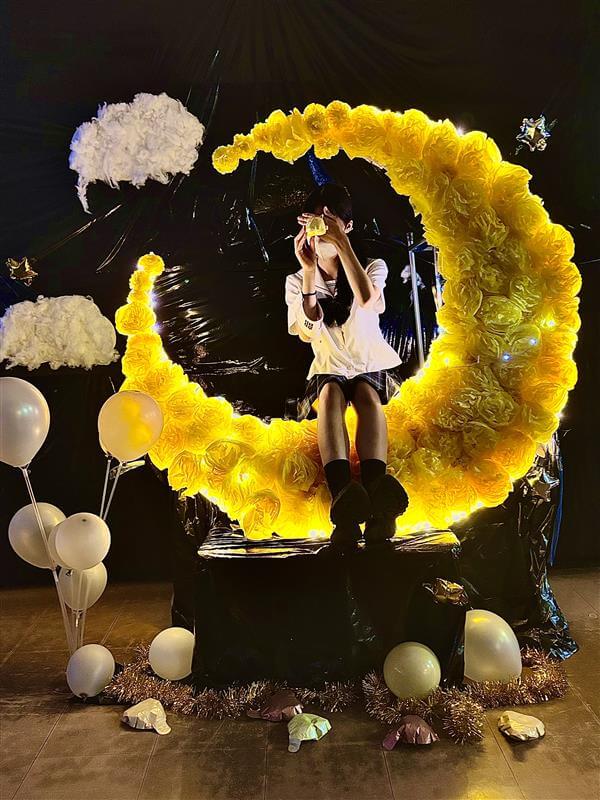友人の「るな」ちゃんと文化祭のフォトスポットの月(luna)を撮りました。照明を消し全体を暗くすることで月と明かりを目立たせ、友人のシルエット感を強くするようにこだわりました。