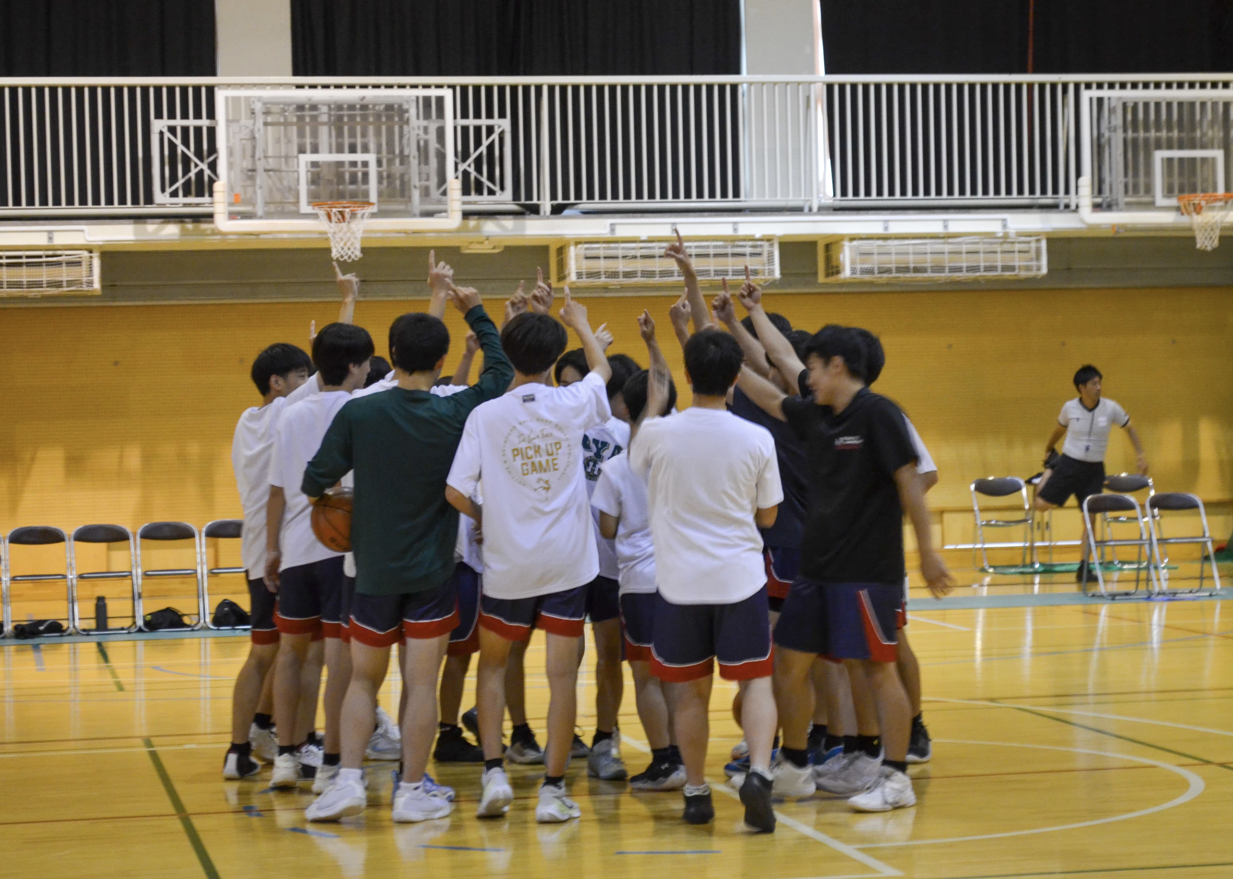 試合前に円陣を組んでる男子バスケットボール部