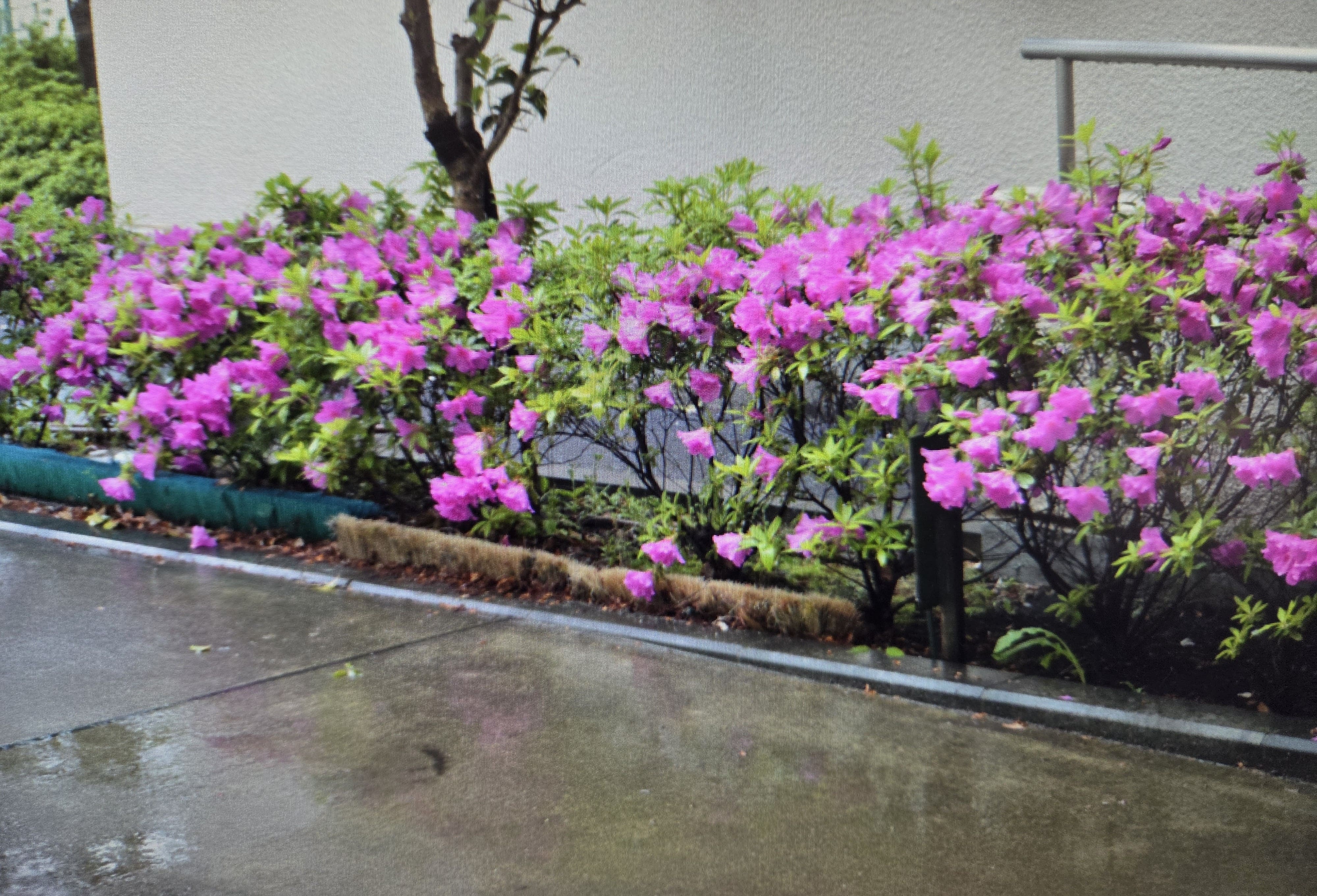 この写真は、雨に濡れたツツジの花が、まるで微笑んでいるかのように見える瞬間を捉えています。花びらに付いた小さな雨滴が光を反射し、宝石のように輝いています。自然の繊細な美しさと優雅さが調和し、見る者に穏やかな感動をもたらします。まるで花が雨の恵みを喜び、微笑みを浮かべているかのような、心温まる一枚です。