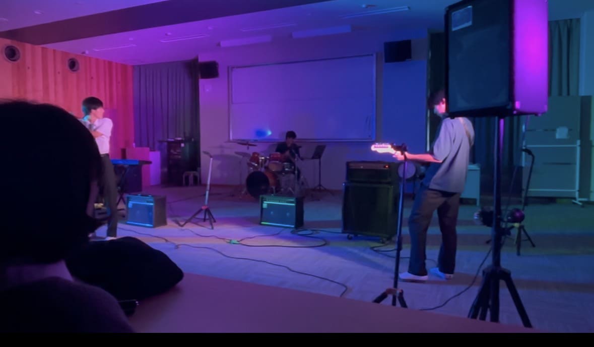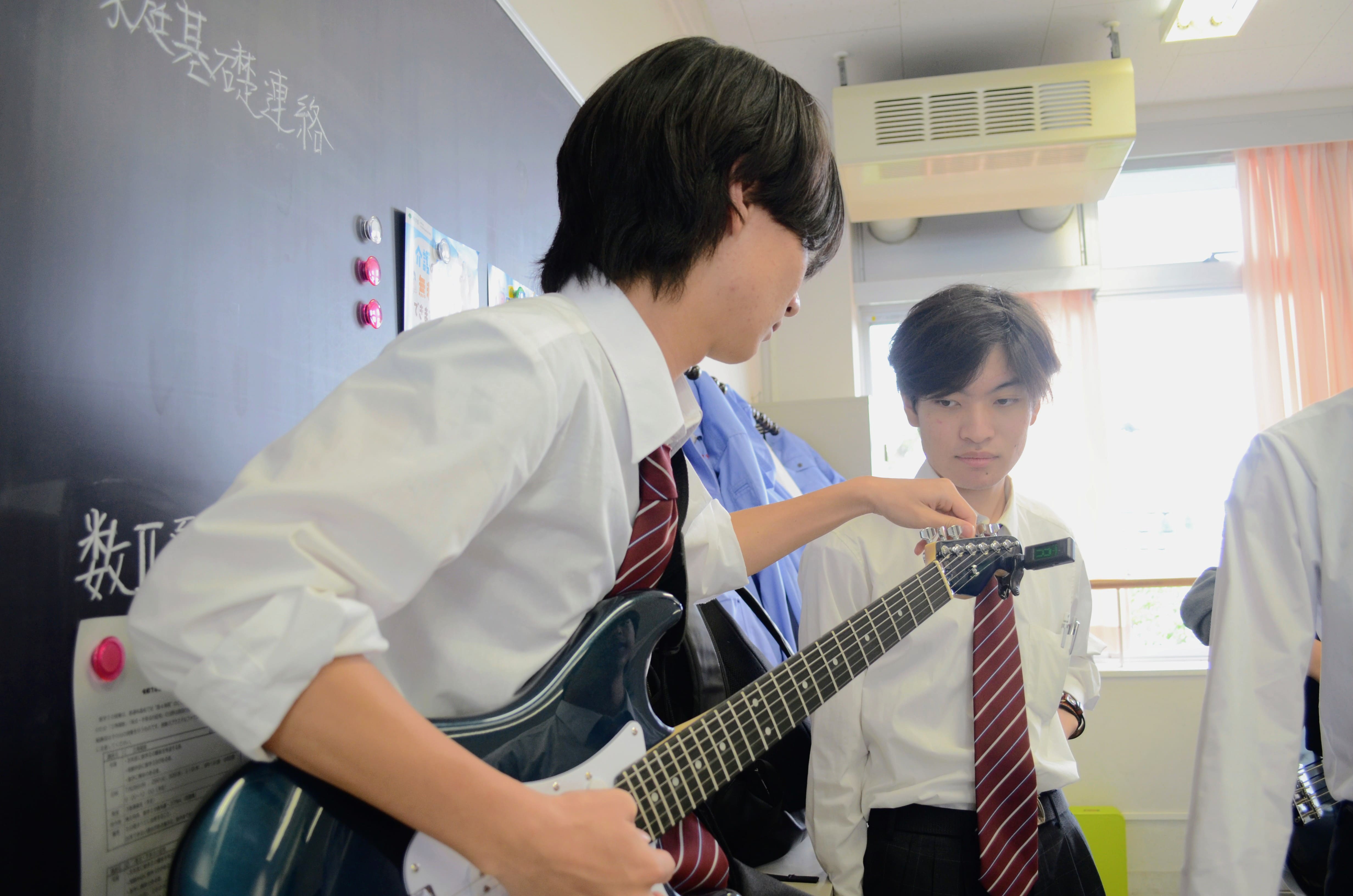 放課後にギターや友達と話して過ごしている写真です