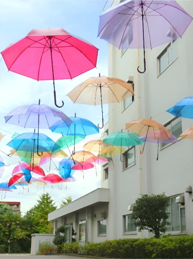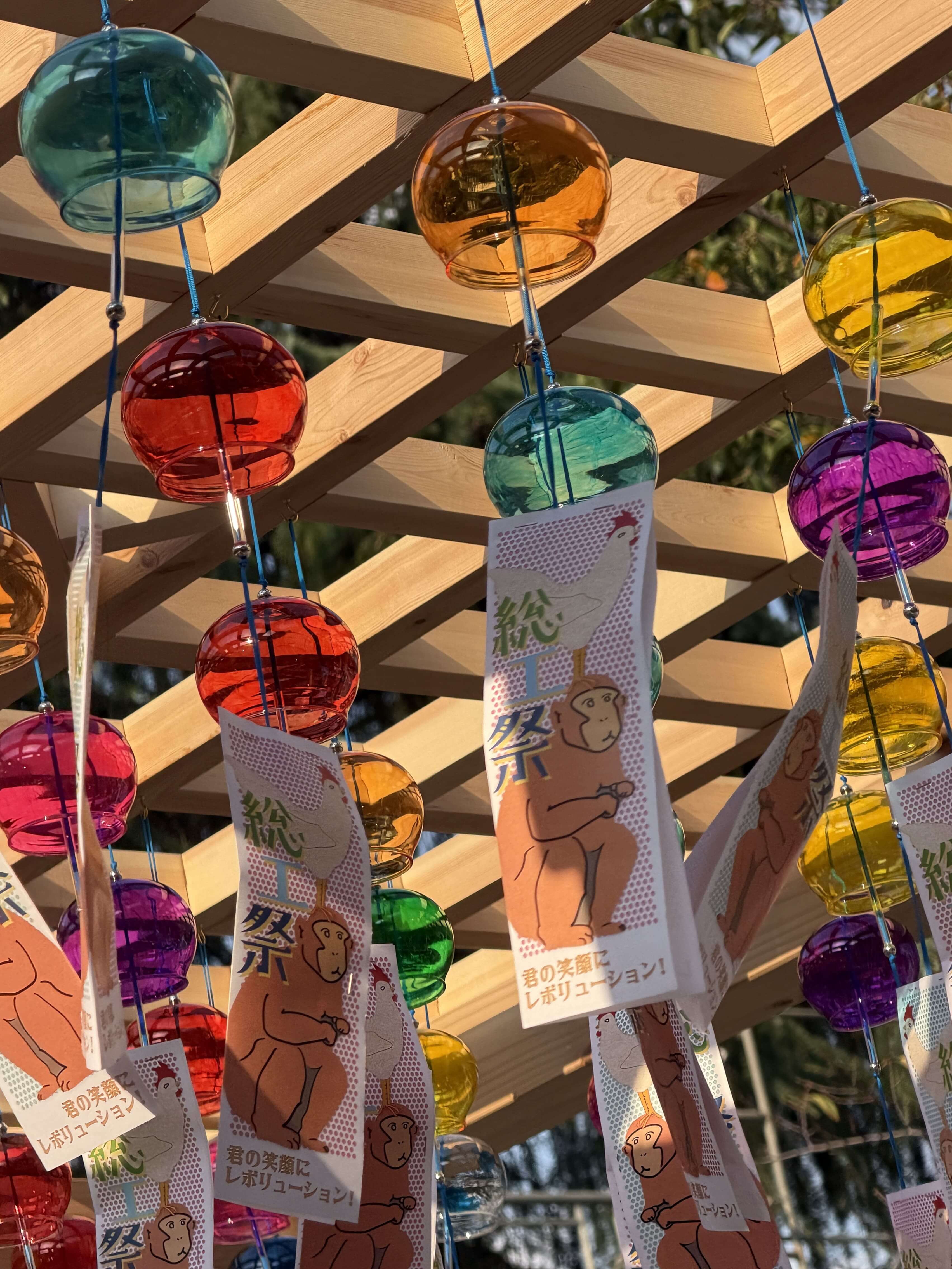 2025年の総合工科高校の文化祭では出入口にたくさんの美しい風鈴を吊り下げました。その色とりどりの風鈴を写真に収めました。