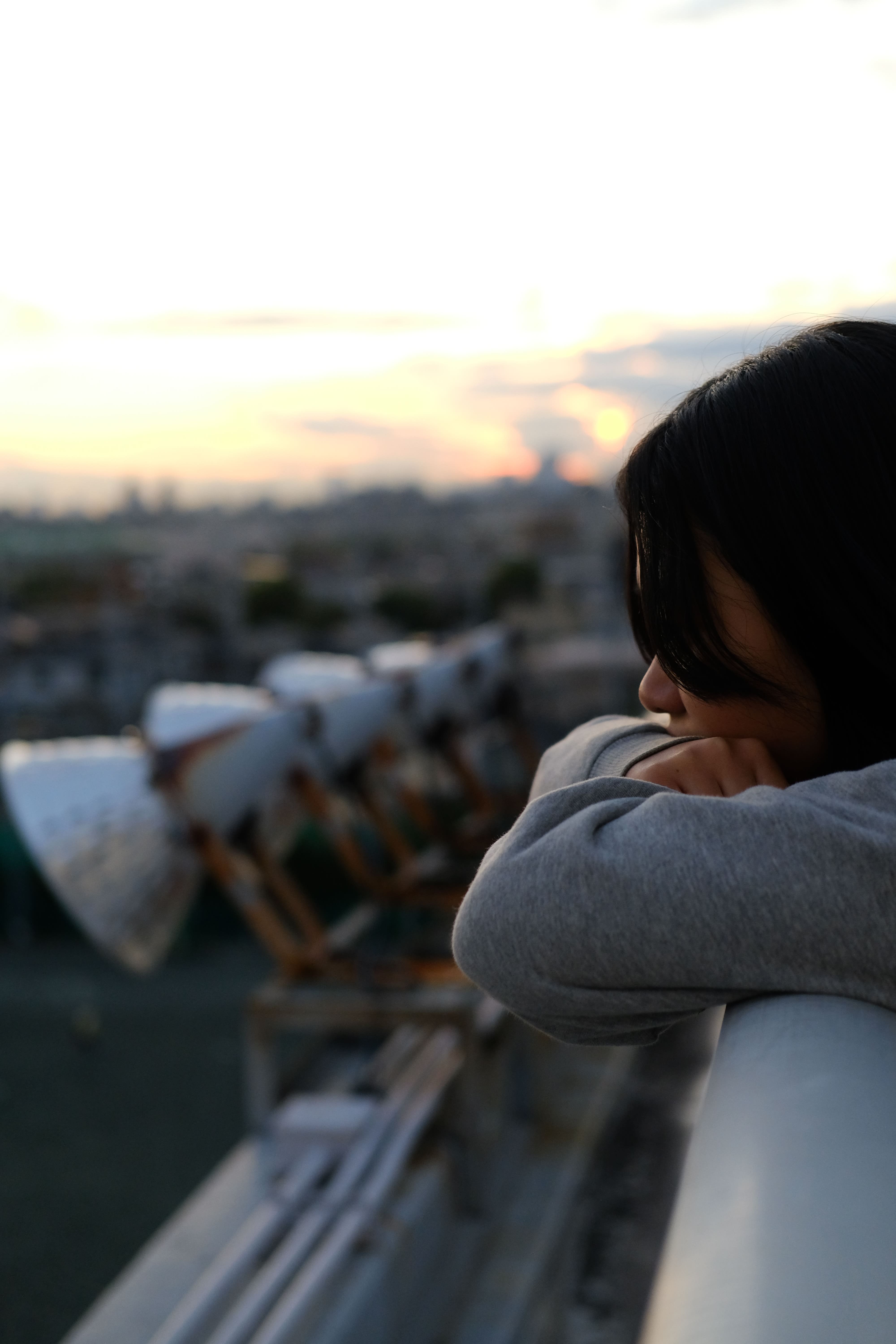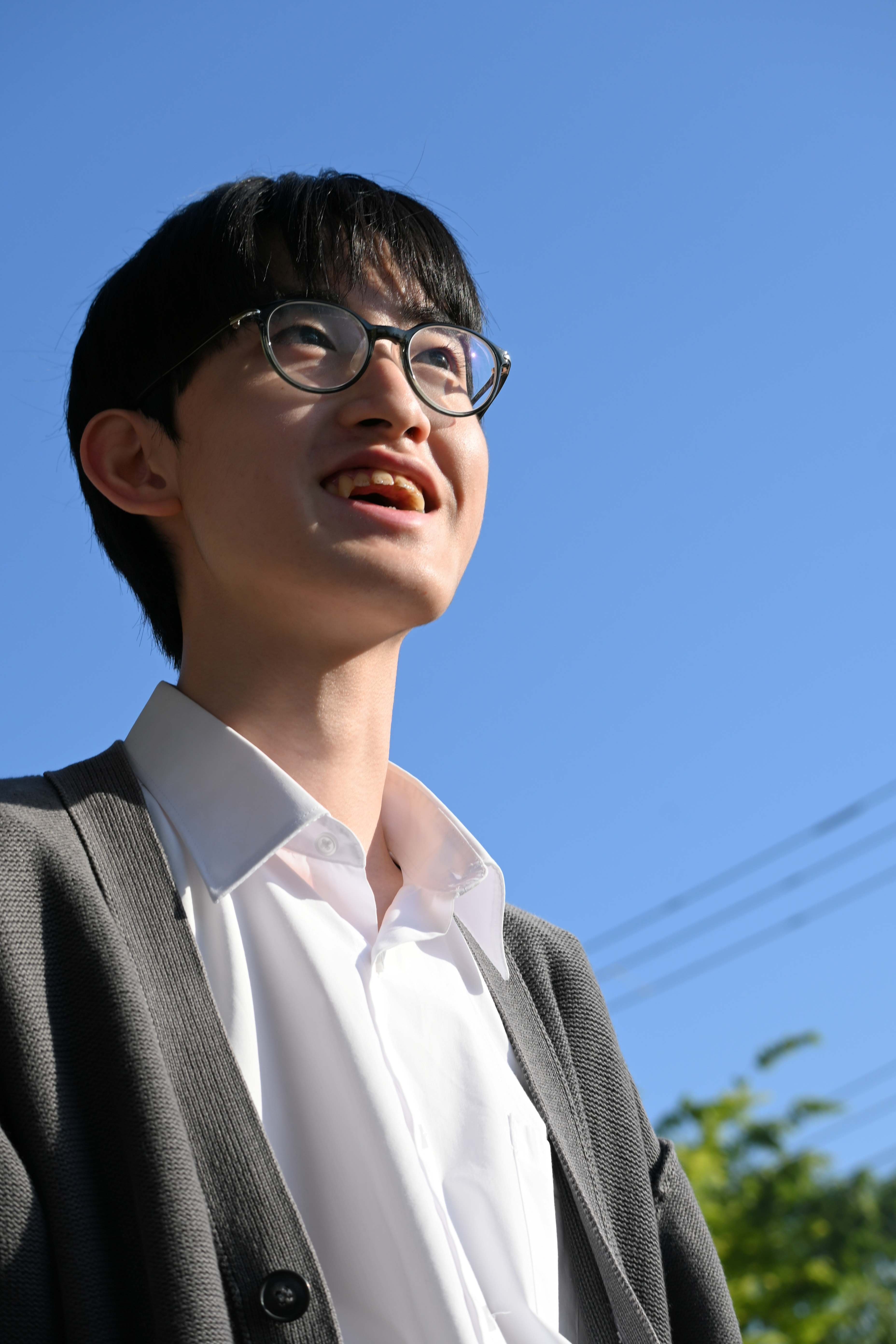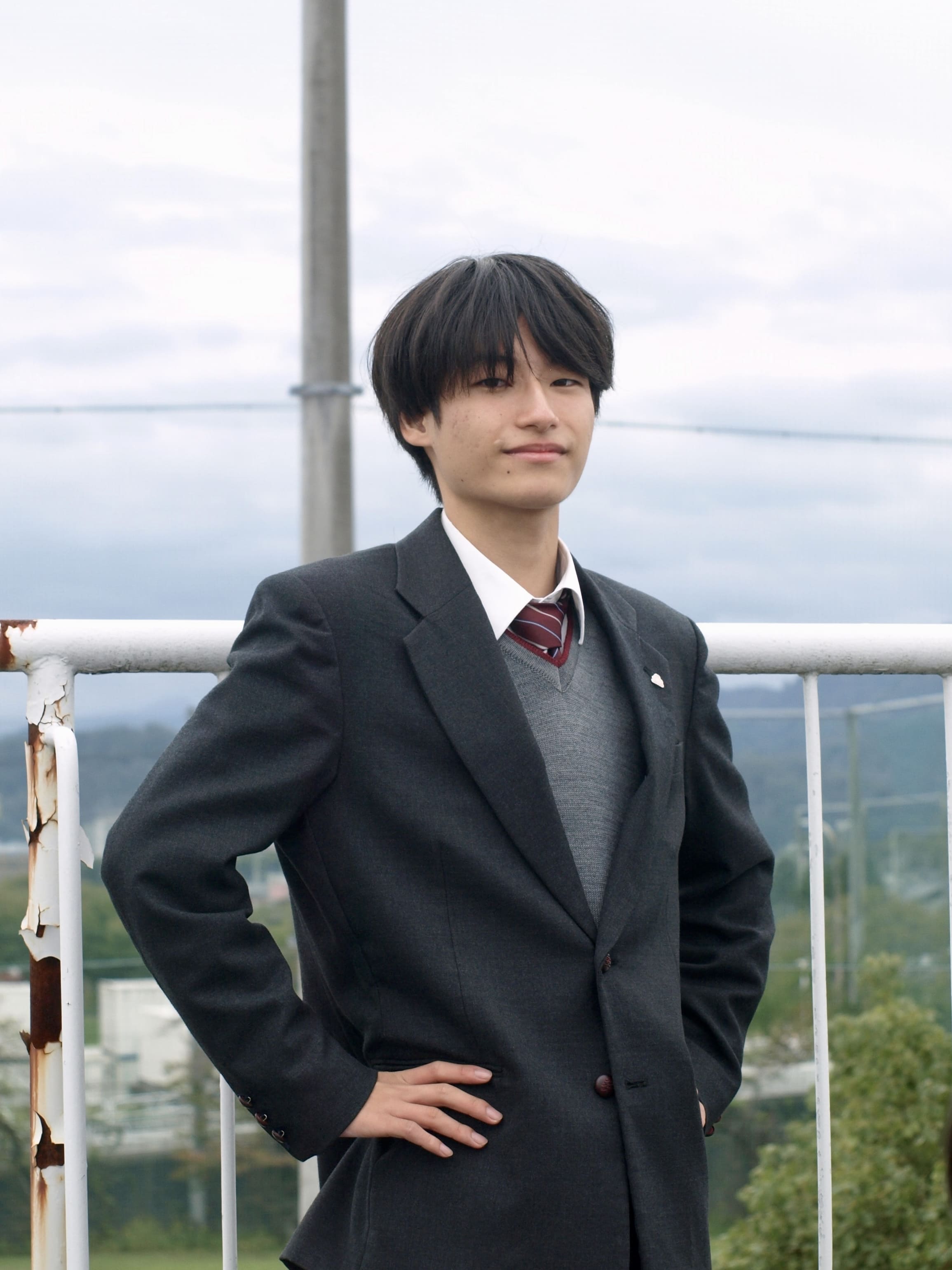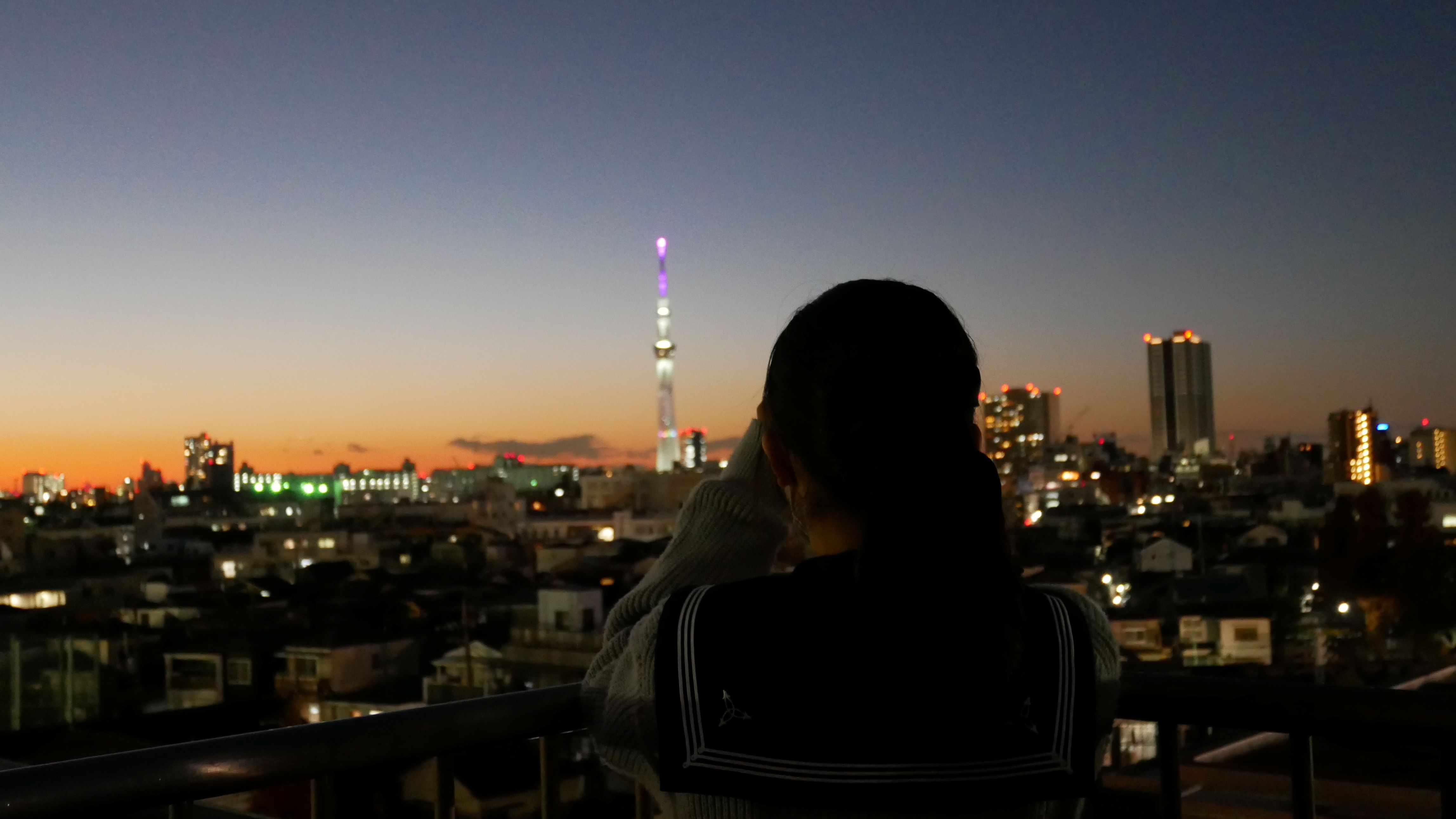 空を見ようと上を向いた時、空だけでなく校庭も見える我が校は、都心で土地が狭い分、二階に校庭があるという特徴的な造りを持っています。そんな造りと夕焼けに染まりつつある空を一枚におさめました。放課後、学校を終えて歩く時、上を向けば夕陽が照らす空と部活動に励む生徒の声が聞こえてきます。周りは薄暗いけれど、上を向けば明るい。だから大丈夫という気持ちを表しました。