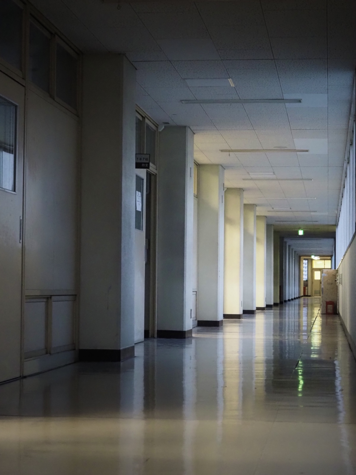 誰もいない教室と外の光のコントラストが綺麗で撮りました。