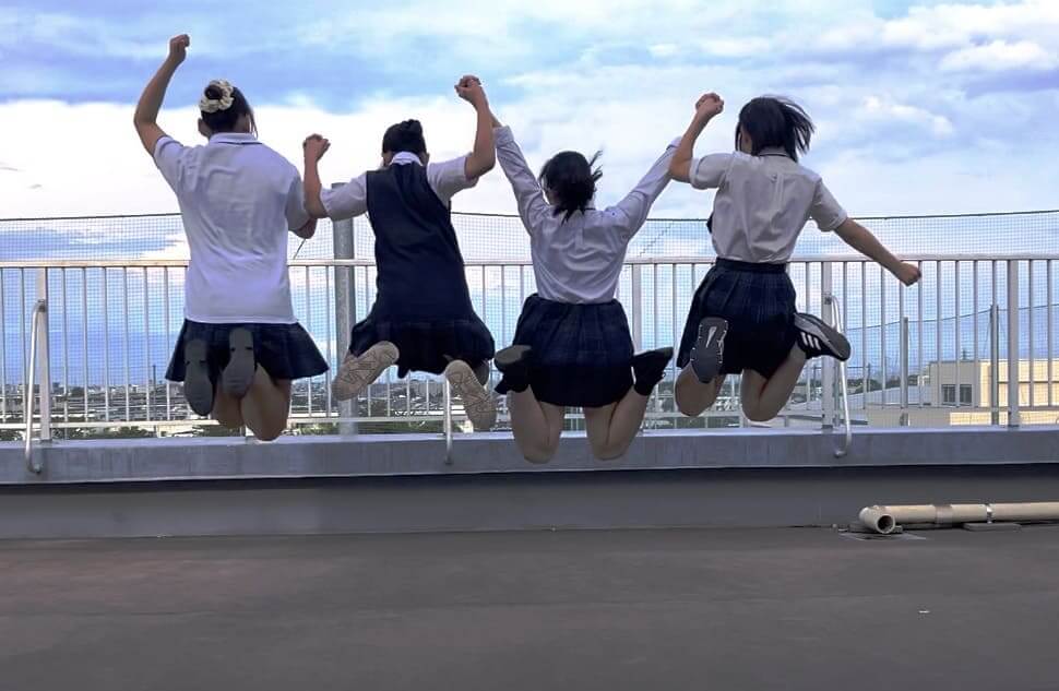 日野台高校の特徴の一つである開放されている屋上で楽しく仲良く青空に向かってジャンプしている一瞬を収めました。日野台高校の明るく、青春を謳歌している雰囲気が写せました。