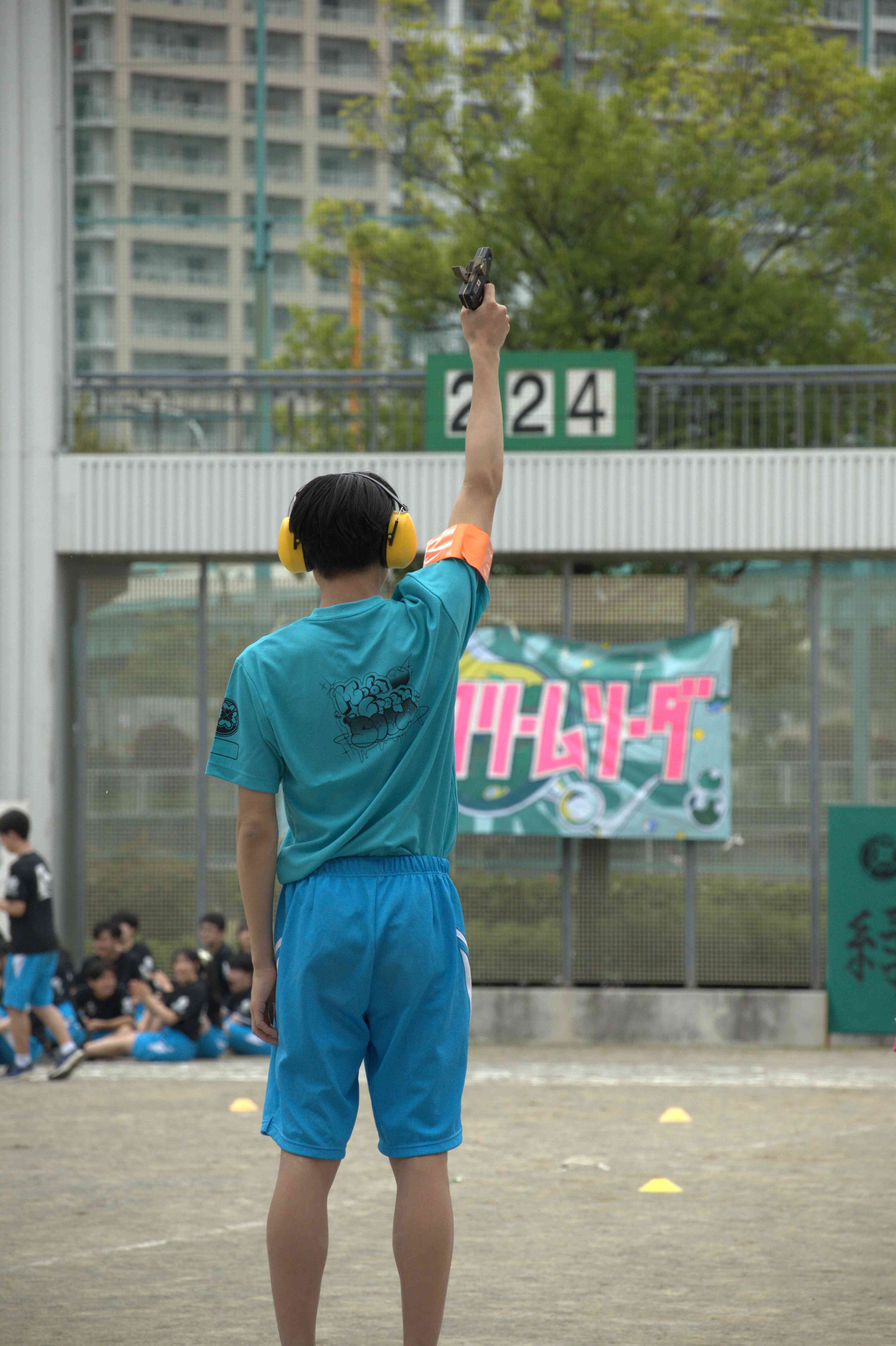 体育祭で先輩がスタートの合図としてピストルを打つ瞬間を1枚に収めました。