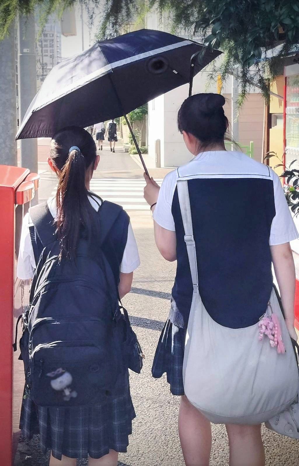 暑い午後の帰り道、日傘の下で肩を寄せる二人。ぬいぐるみやキーホルダーが、それぞれの個性をさりげなく語ってる。顔は見えないけど、関係性や空気感がじんわり伝わる、そんな一枚です。