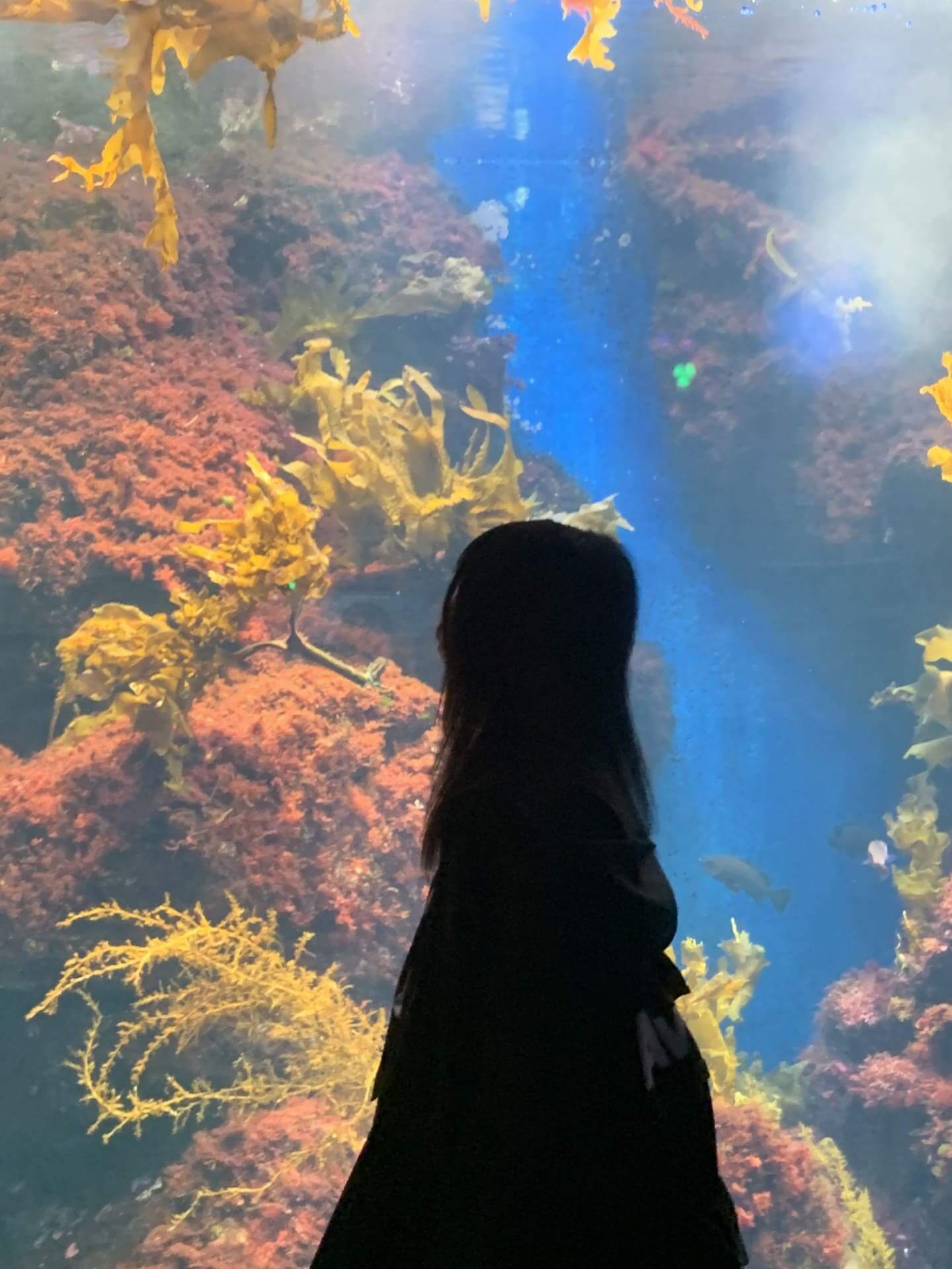 遠足で行った水族館で偶然撮れた写真です。ガラスの向こうに広がる小さな海の世界を友達と一緒にカメラに収めました。