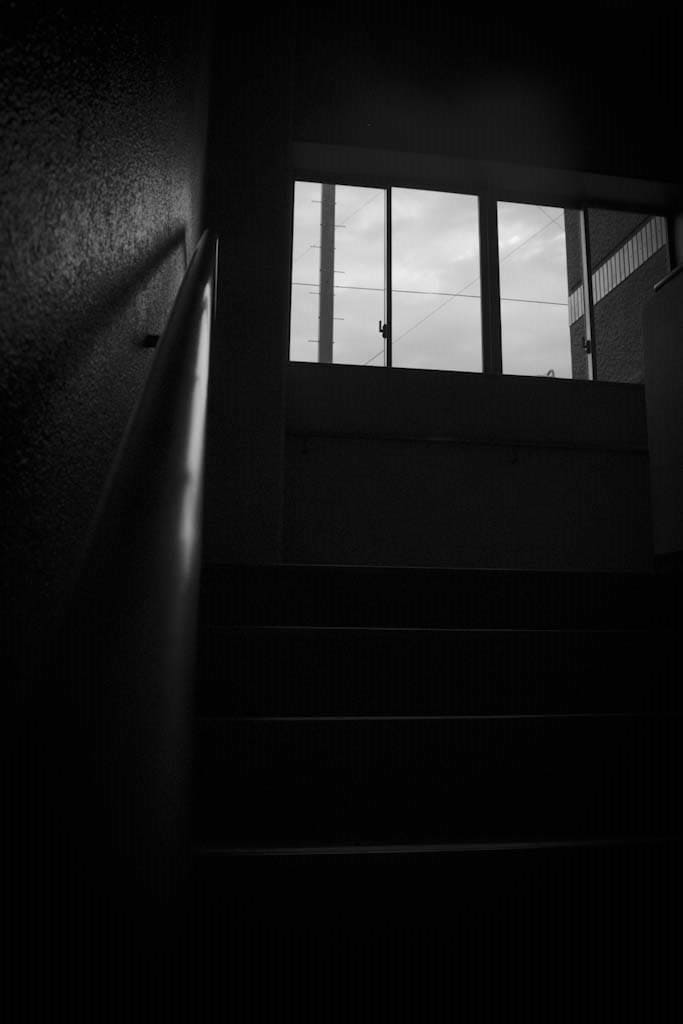 薄暗く寂し気な空気を纏う踊り場をモノクロで撮影した写真。