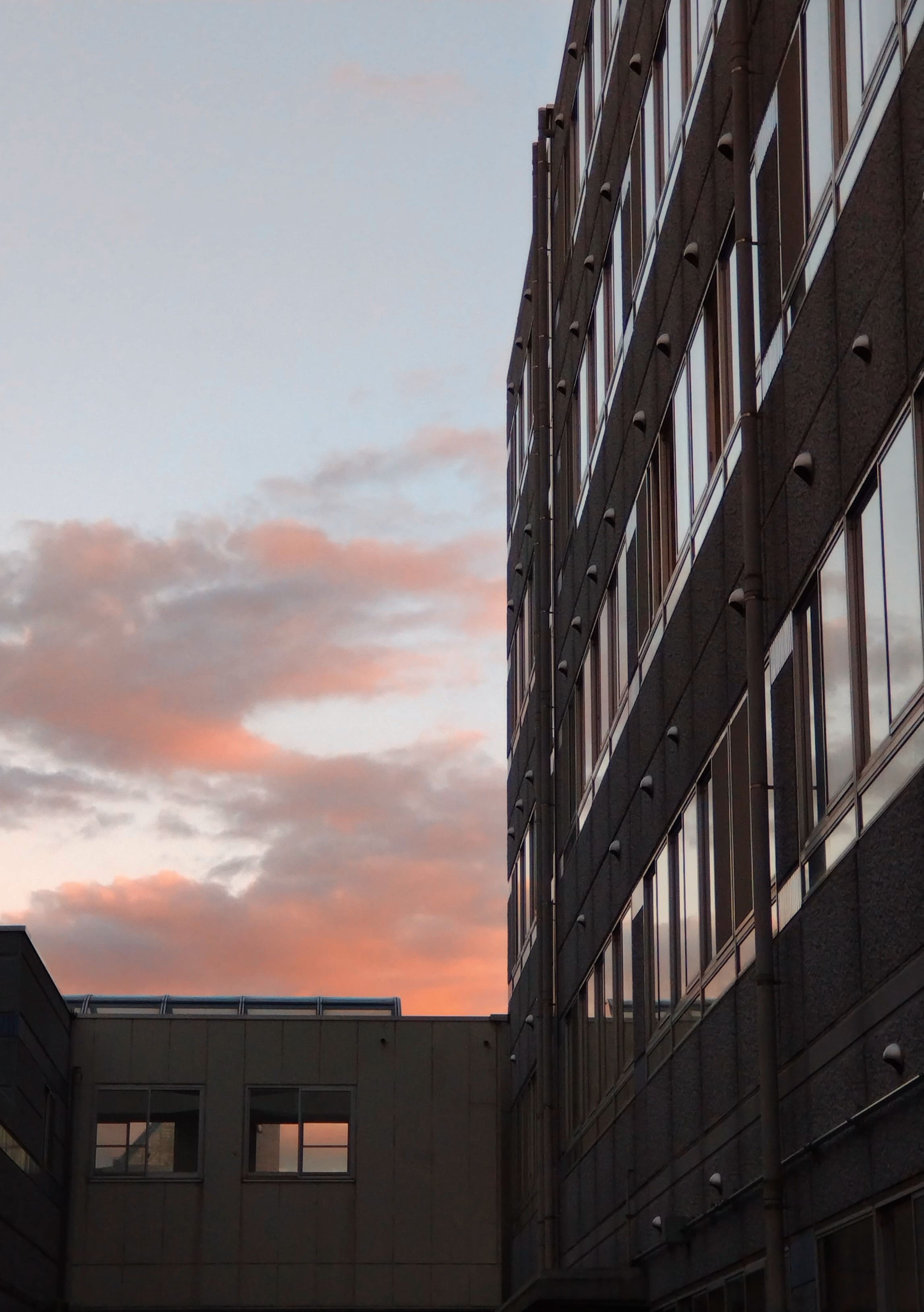 夕日でオレンジ色に染まった雲と校舎を撮りました。影の濃い校舎と、明るい色の空が対比になっています。