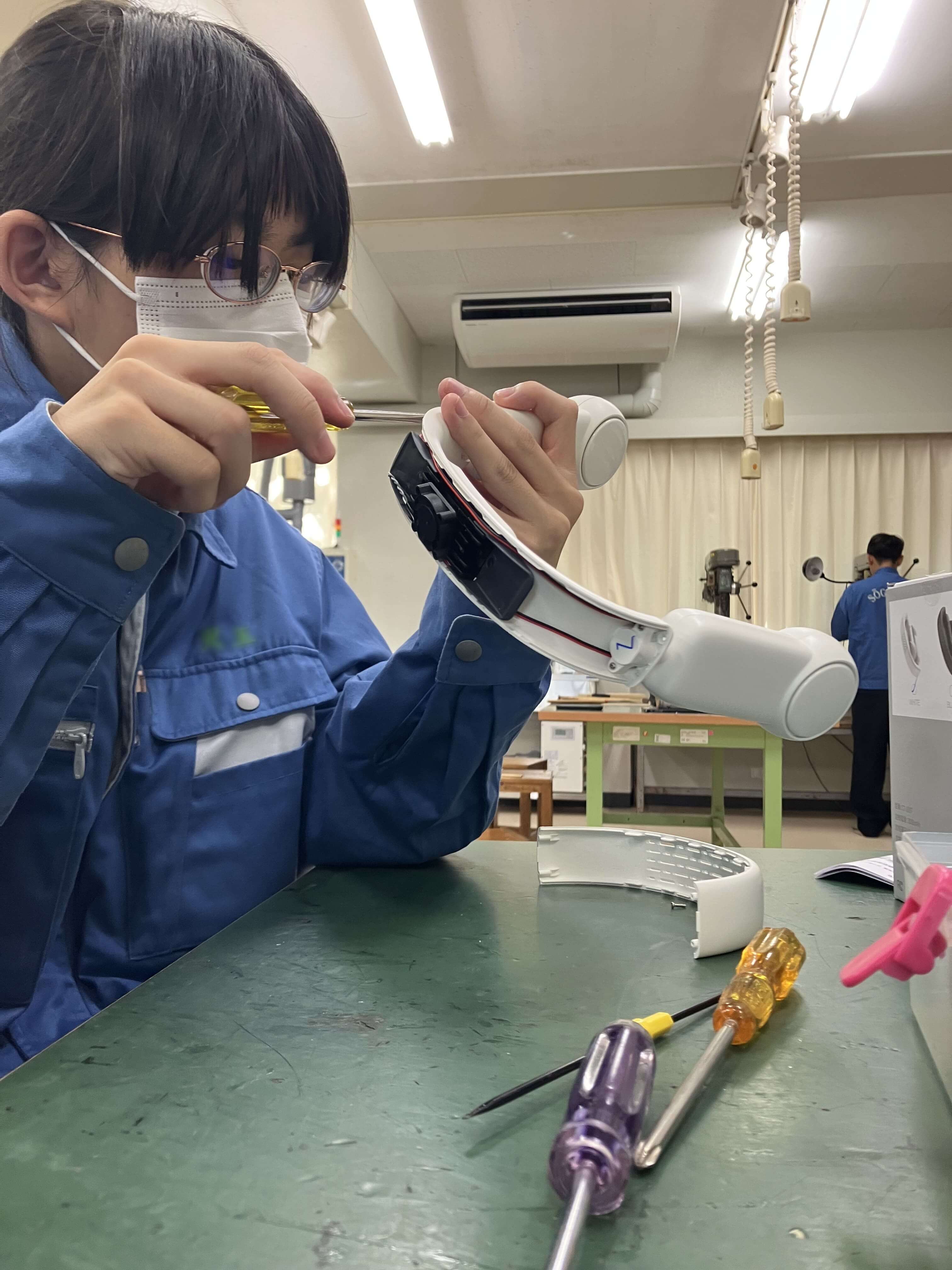 機材を分解して内容を理解しようとする、工業高校の実習風景